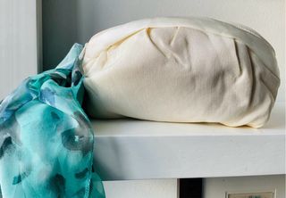 Elegante pochette in tessuto a coste color champagne, con chiusura a zip. Accompagnata da un foulard in voile con stampa astratta nei toni del verde acqua e del blu. - Pochette con finitura a coste, misura 23x16 cm - Foulard in voile leggero, misura 95x95 cm