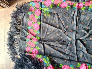 Elegante foulard con un vivace motivo floreale. - Base nera. - Decorato con rose rosse e dettagli blu. - Bordi con frange nere.