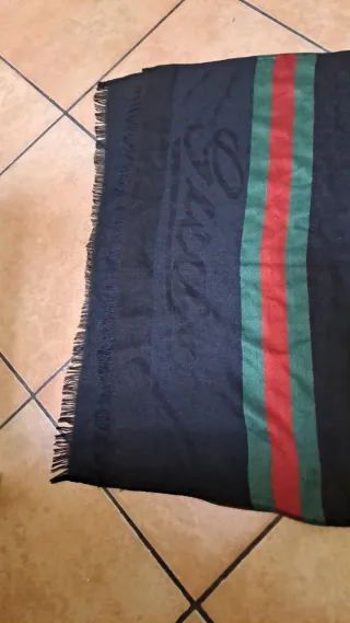 Elegante foulard Gucci con il classico motivo a strisce. - Design iconico. - Trama jacquard con logo. - Frange decorative.