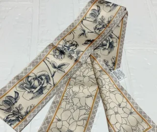 Elegante foulard Christian Dior con una stampa floreale e di farfalle. Un accessorio raffinato per aggiungere un tocco di stile. - Stampa floreale e di farfalle. - Logo Christian Dior visibile.