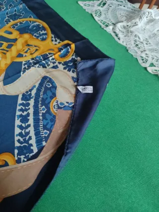 Elegante foulard in seta con un motivo di catene e nastri. - Motivo: catene e nastri - Materiale: seta - Colore: blu e oro