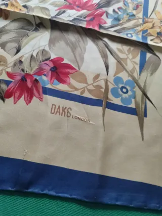 Elegante foulard in seta con una stampa floreale vivace. Un accessorio raffinato per ogni occasione. - Motivo floreale multicolore su fondo beige. - Bordatura blu. - Logo DAKS London visibile.