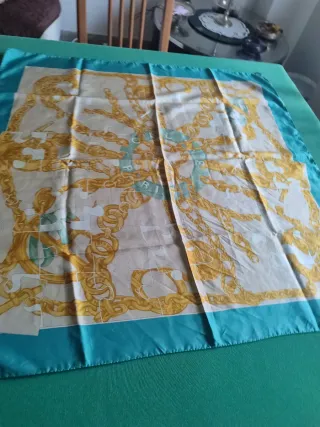 Elegante foulard in seta con un motivo di catene dorate e dettagli color turchese. - Motivo a catene. - Bordi color turchese. - Tessuto in seta.