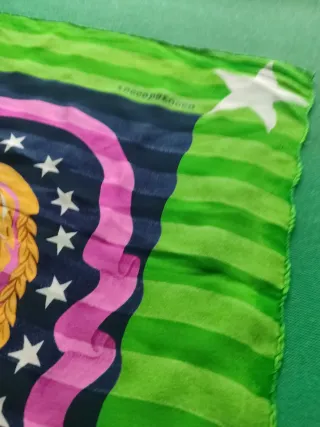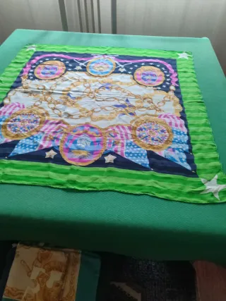 Bellissimo foulard in seta Rocco Barocco con un design vivace e colorato. Un accessorio elegante per ogni occasione. - Motivo a catene dorate e simboli. - Bordi a righe verdi. - Tessuto in seta pregiata.