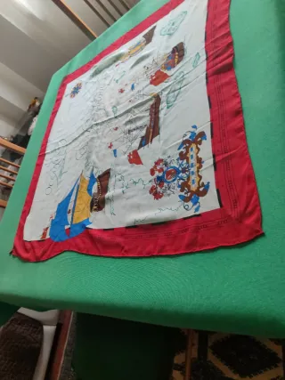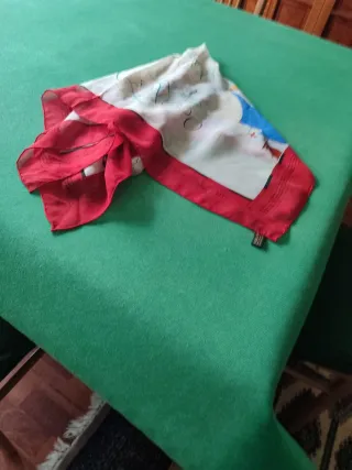 Elegante foulard in seta, con un vivace bordo rosso e un disegno colorato. - Materiale: Seta - Colore: Multicolor e rosso - Condizioni: Ottime