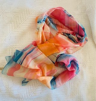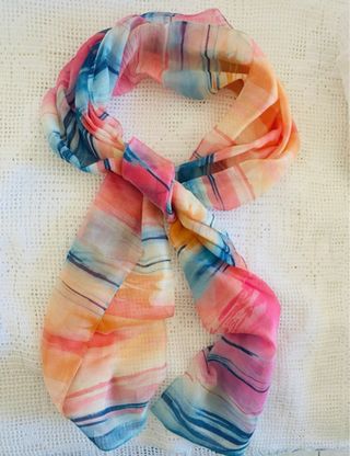 Foulard in fantasia multicolor, perfetto come accessorio per capelli o collo. - Tessuto leggero e trasparente. - Motivo a righe astratte. - Tonalità vivaci e sfumate.
