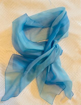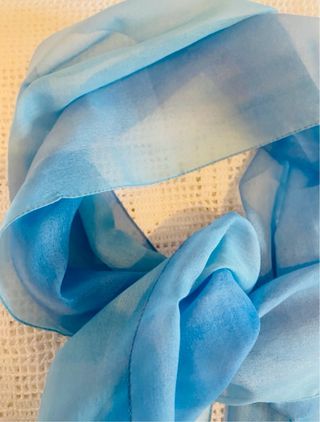 Foulard leggero in tonalità azzurre, versatile e facile da indossare. - Tessuto leggero e trasparente. - Bordi rifiniti con cucitura. - Può essere usato come fascia per capelli.