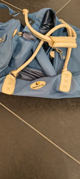 Borsone da viaggio Roncato, pratico e capiente. - Colore blu con dettagli beige. - Logo Roncato applicato sul fronte. - Manici in ecopelle. - Tracolla regolabile. Ben conservato, unici segni evidenti di usura sono sui manici