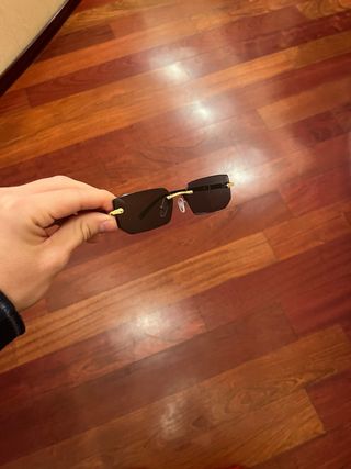 Eleganti occhiali da sole con montatura color oro e lenti scure. - Design senza montatura. - Dettagli dorati sulle aste.