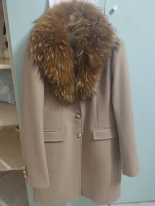 Elegante cappotto sartoriale color beige/sabbia, NUOVO (tasche ancora cucite). Vestibilità perfetta e stile raffinato. Pelliccia: Collo in vera volpe removibile, folto e morbidissimo. Dettagli: Bottoni gioiello dorati su chiusura e polsini. Taglia: 48. Stato: Nuovo, mai indossato, condizioni impeccabili.