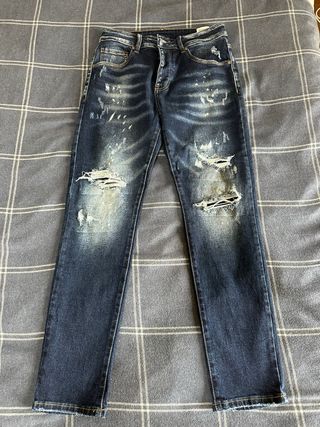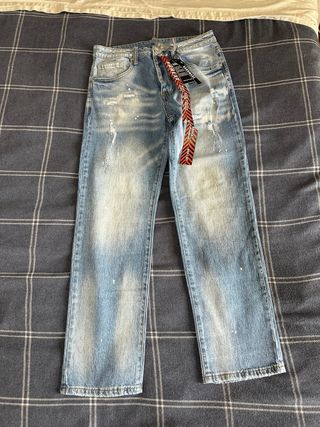 Jeans da uomo in denim con un lavaggio chiaro e dettagli strappati. - Vestibilità dritta - Effetto slavato e macchie di vernice - Tasche anteriori e posteriori - Chiusura con zip e bottone Prezzo trattabile