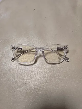 Occhiali da vista Chrome Hearts con lenti anti luce blu. - Montatura trasparente. - Dettagli argento sulle aste. - Design squadrato.