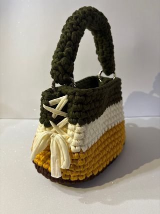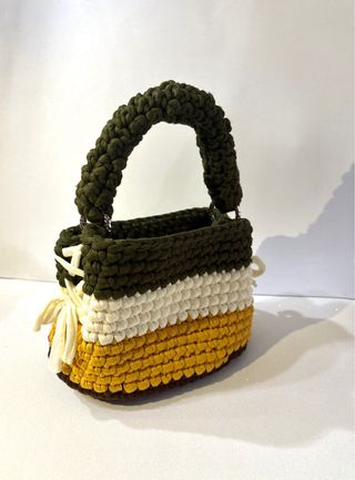 Borsa a mano realizzata all'uncinetto con un design a righe. - Manico in tinta unita verde scuro. - Corpo della borsa a righe bianche, gialle e verdi. - Dettagli con frange e lacci bianchi.