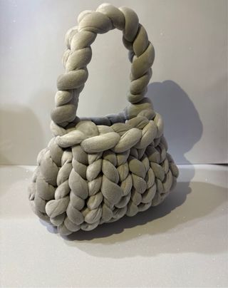 Borsa realizzata con filato effetto marshmallow, morbida e voluminosa. Il design intrecciato la rende unica. - Materiale: filato soffice. - Manico intrecciato.