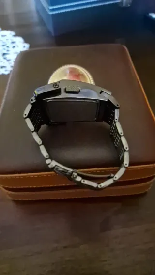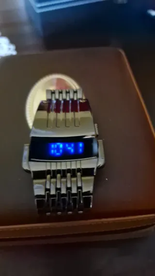 Elegante orologio digitale con display a LED.stile anni 70 - Design moderno e accattivante. - Cinturino in metallo argentato. - Dettagli in rosso sulla cassa.