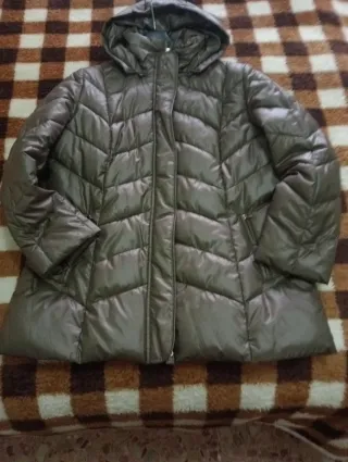 Elegante giaccone da donna con un design trapuntato a chevron. Presenta chiusura con zip e pratiche tasche. Spalle cm 47 Torace cm 59 Lunghezza cm 77 - Cappuccio integrato. - Tessuto lucido effetto metallizzato.