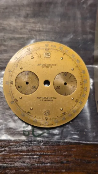 Quadrante per orologio cronografo vintage marca Olympic. Presenta una scala tachimetrica esterna e due contatori. Dimensioni 35 - Quadrante color oro. - Scritta CHRONOGRAPHE OLYMPIC. - Indicazione ANTIMAGNETIC 17 RUBIS. - Scala BASE 1000 e BASE 60. - SWISS MADE sul fondo.