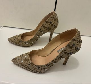 Eleganti scarpe da donna con tacco. - Fantasia monogramma Guess. - Dettagli con borchie a punta. - Punta affusolata.