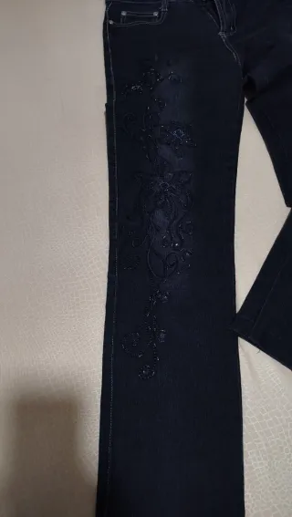 Jeans scuri con dettagli ricamati su una gamba che lo rendono originale e unico. - Tessuto denim. - Decorazioni floreali ricamate con perline. - Taglio dritto. - taglia 28 che corrisponde a 42