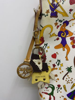 Borsa a spalla con una vivace fantasia. Realizzata in pelle, presenta manici in cuoio e un charm a forma di stella. - Fantasia colorata su fondo bianco. - Manici in cuoio. - Charm a stella con logo.