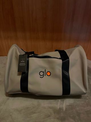 Borsone firmato GLO, un accessorio versatile e di tendenza. - Colore beige con dettagli arancioni. - Logo GLO ben visibile. - Manici neri resistenti. - Tasca esterna con zip.