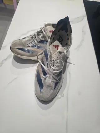 Scarpe da corsa Adidas Adios Pro 3. - Design con strisce blu. - Tomaia bianca traspirante. - Suola spessa e ammortizzata.