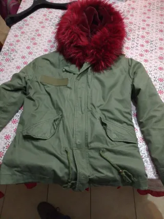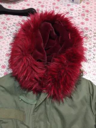 Giubbotto invernale da donna con un caldo cappuccio bordato di pelliccia sintetica rossa. - Cappuccio con pelliccia sintetica rossa. - Tessuto esterno verde. - Chiusura con bottoni a pressione.