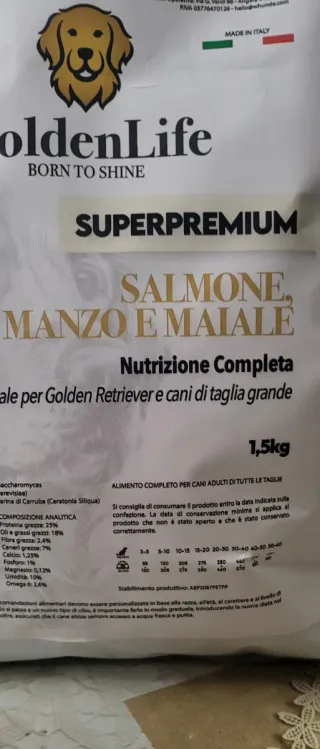 Busta completo per cani adulti di taglia grande, ideale per Golden Retriever. Formulato con salmone, manzo e maiale. - Superpremium - Nutrizione Completa - Made in Italy - Peso: 1,5kg
