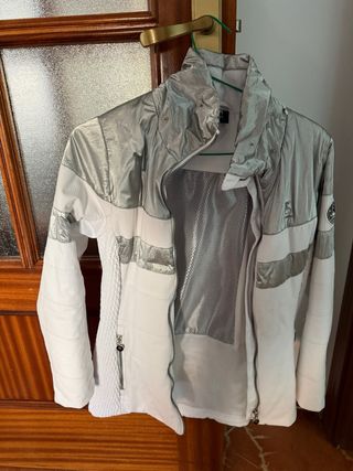 Set di due giacche con un design moderno e accattivante. - Giacca principale in colore argento brillante. - Dettagli e maniche in bianco. - Cerniera frontale. - Collo alto.
