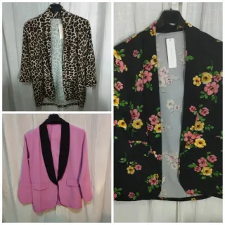 Set di tre giacche eleganti, perfette per completare ogni outfit. - Giacca leopardata con maniche a tre quarti e brillantini - Giacca nera con fantasia floreale colorata. - Giacca rosa con revers neri.