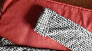 Scatola con giacche e vestiti vari. - Giacca blu a coste. - Vestiti con righe rosse e grigie.