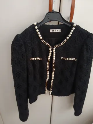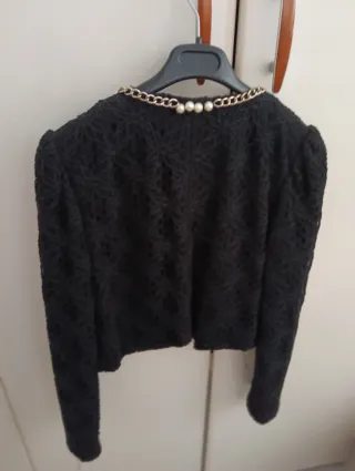Elegante giacca da donna in pizzo nero, perfetta per completare un outfit. - Dettagli con perle e catena dorata. - Maniche lunghe. - Chiusura frontale.
