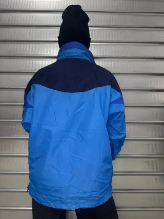 Giacca Columbia da montagna, perfetta per le avventure all'aria aperta. - Design a pannelli blu e blu scuro. - Logo Columbia ricamato sul petto. - Collo alto e cappuccio integrato. - Polsini regolabili con velcro.