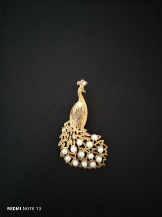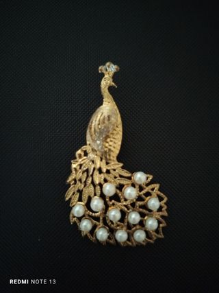 Bellissima spilla vintage a forma di pavone. Elegante e raffinata, perfetta per aggiungere un tocco di classe al tuo look. - Realizzata in metallo color oro. - Decorata con piccole perle bianche. - Design vintage anni '70/'80.