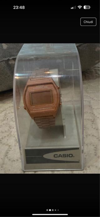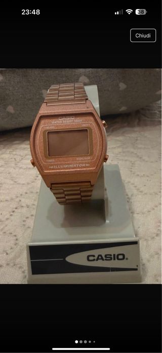 Orologio da polso Casio con cinturino e cassa in color oro. - Resistente all'acqua fino a 50 metri. - Funzione illuminator per la visualizzazione al buio. piccolo segno sopra il quadrante