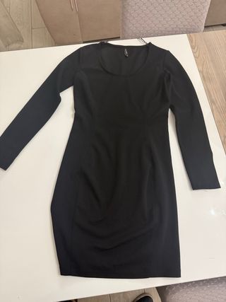 Elegante abito nero a manica lunga, perfetto per diverse occasioni. - Tessuto morbido e confortevole. - Linea aderente che valorizza la figura. - Scollo rotondo.
