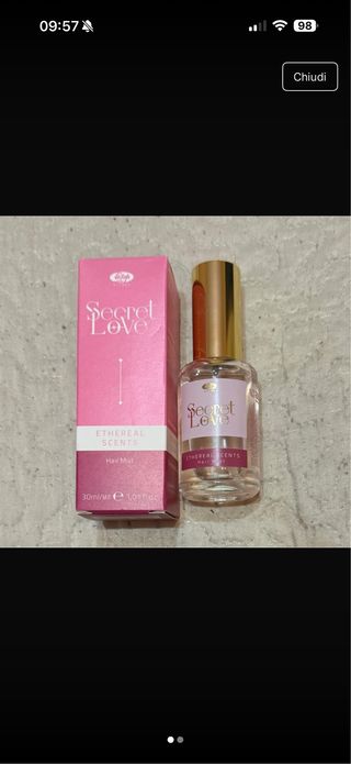 Profumo per capelli Secret Love nella fragranza Ethereal Scents. La confezione include una scatola rosa e una bottiglietta con tappo dorato. - Fragranza: Ethereal Scents - Volume: 30ml / 1.01 fl oz