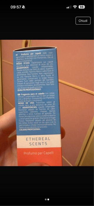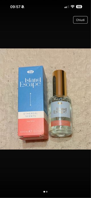 Profumo per capelli Island Escape di Boots, fragranza Ethereal Scents. - Formato spray da 30ml. - Tappo dorato.