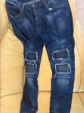 Jeans da uomo in denim. - Vestibilità comoda. - Dettagli strappati e a coste sulle ginocchia. - Modello biker.
