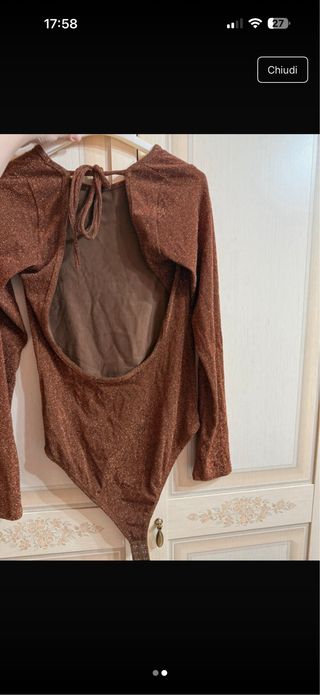 Elegante body con dettagli glitter e schiena scoperta. - Tessuto scintillante color bronzo dorato. - Design con incrocio sulla schiena. - Taglia unica.