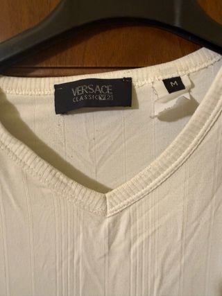 T-shirt da uomo Versace in un elegante. Presenta un motivo a coste verticali che aggiunge un tocco di stile. - Scollo a V - Maniche corte - Tessuto a coste verticali