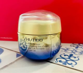 Crema de día Shiseido Vital Perfection con protección SPF 30. - Envase con detalles dorados y degradado azul. - Tapa transparente. - Formato de 50ml.