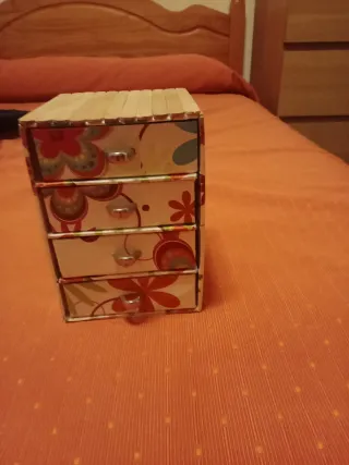Piccolo cassettino per gioielli con quattro cassetti, perfetto per conservare tesori. - Dimensioni 16x11x11 cm - Design con fiori in tonalità rosse e multicolori. - Maniglie argentate su ogni cassetto. - Finitura superiore in legno.