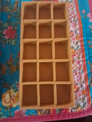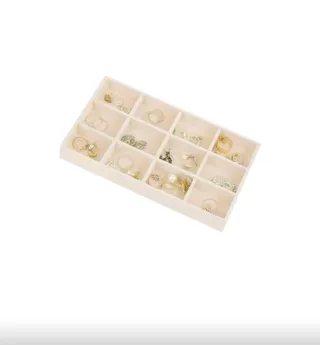 Nuovo organizer gioielli con molteplici scomparti per mantenere i tuoi accessori in ordine. Dimensioni: 12,5x21x2,5cm. Design con 18 scomparti. Ideale per anelli, orecchini e collane piccole. Finitura in tessuto beige.