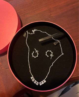 Elegante set di gioielli in argento con dettagli in zirconi. Include collana e orecchini. Design circolare con pietra centrale. Anello abbinato.