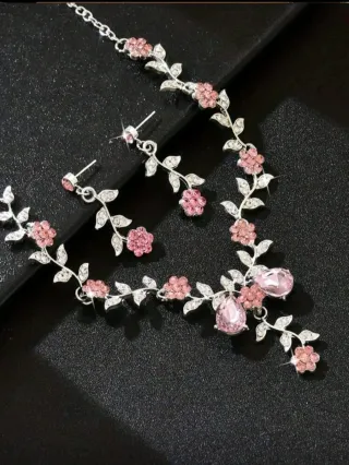 Elegante parure di gioielli con un design floreale. Il set include una collana e un paio di orecchini pendenti. - Dettagli floreali con pietre rosa. - Elementi decorativi in argento. - Design raffinato e femminile.