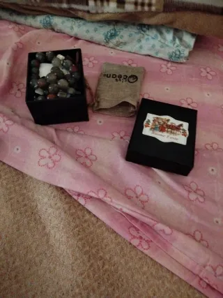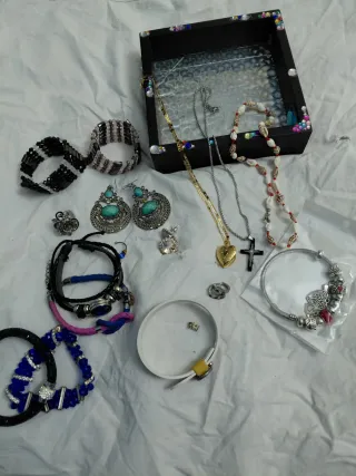 Lotto di gioielli assortiti, venduti con la scatola visibile nell'immagine. - Collane con ciondoli e perline. - Bracciali di diversi stili e materiali. - Orecchini con pietre decorative. - Anelli assortiti. - Scatola decorata per riporre i gioielli.3 di questi mai usati