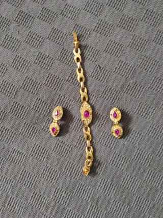 Elegante set di gioielli. Design con pietre rosa e dettagli dorati. Include braccialetto e orecchini abbinati.