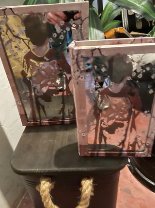 Set di due gioielli decorativi con un design orientale. Finitura esterna con stampa floreale e silhouette femminile. Coperchio superiore con bordo in tonalità chiara.