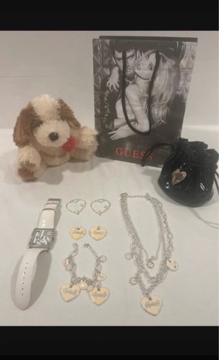Lote di GUESS originale composto da: collana, bracciale, 2 paia di orecchini e orologio bianco, batteria appena sostituita, include la borsa portagioie e il peluche, tutto in perfetto stato, regalo borsa Guess